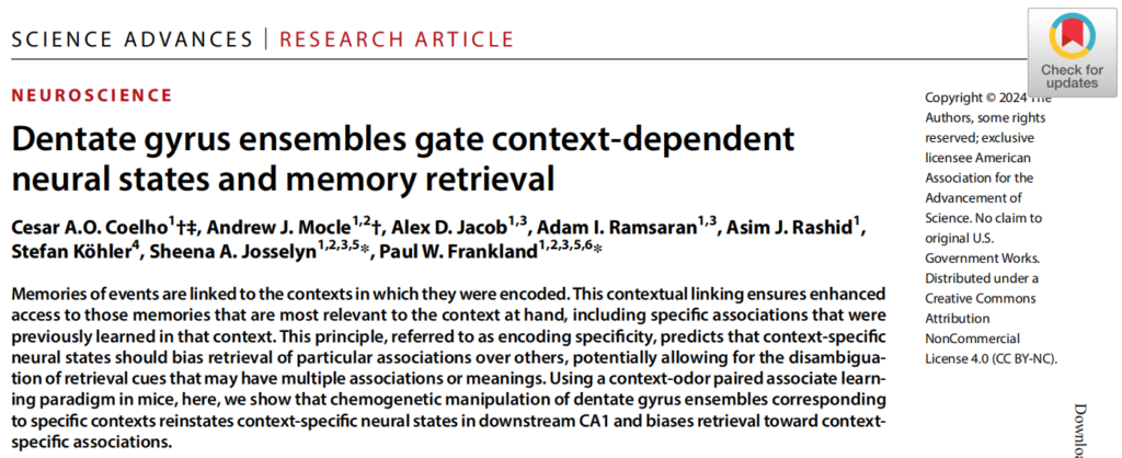 2024年8月2日加拿大多伦多儿童医院等机构在《Science Advances》发表文章,利用病毒标记与化学遗传以及钙成像等技术揭示了context依赖的记忆提取机制。他们发现,齿状回(dentate gyrus,DG)中与情境相关的神经元集这一过程至关重要,激活特定情境的DG集群能以情境依赖的方式偏向记忆提取,恢复CA1中情境特定的神经状态。DG神经元集群的再激活不会改变CA1的全局群体动态,但会恢复CA1中情境特定的集群活动。