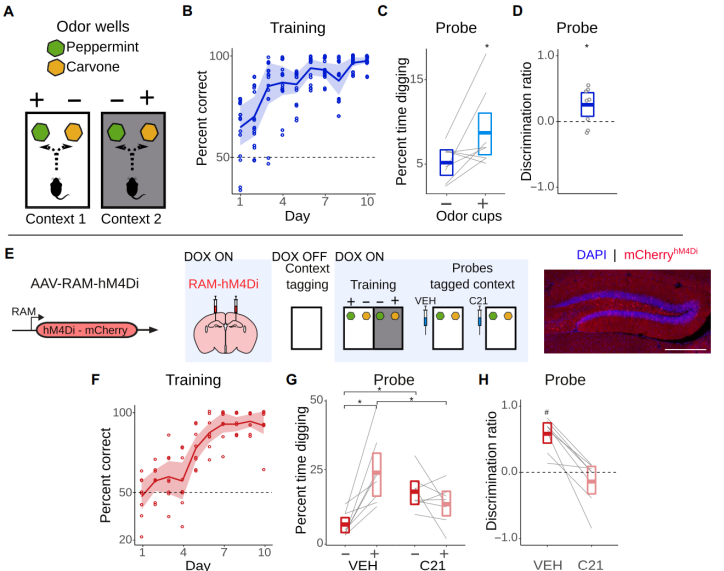 首先,作者设计情境 – 气味配对联想学习范式,训练小鼠在两种空间情境(白色情境和黑色情境)中学习,挖掘不同的气味(薄荷味和香芹酮味)井与奖励(糖粒)之间的关联。训练后,小鼠在测试中能分辨情境并正确挖掘与奖励相关的气味井,在相应情境中花更多时间挖掘之前经过强化学习的气味井,表明它们学会了利用分辨情境来消除气味线索的歧义。