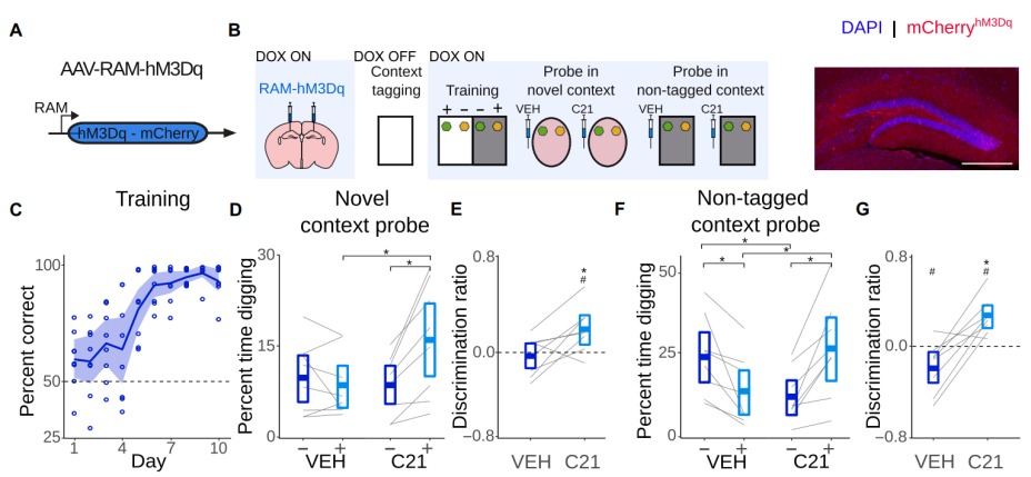 同时,进一步实验表明,在新情境中,化学遗传激活DG context ensemble会使小鼠花更多时间挖掘与标记情境相关的气味井;在非标记情境中,激活与标记情境对应的DG context ensemble会逆转小鼠的情境特定偏好,使它们挖掘之前在标记情境中强化的气味井。使用光遗传学方法也得到了类似的结果。