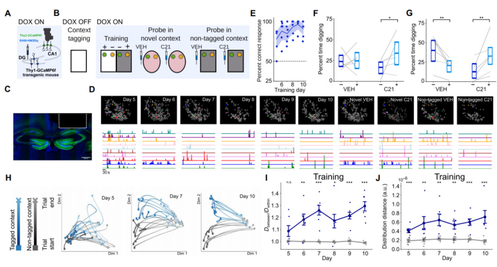 接着,研究人员关注了DG中标记的神经元集群的重新激活是否会改变下游海马区域的情境特定的活动模式?为了回答这一问题,研究人员利用钙成像技术探究在训练过程中,CA1区是否会出现特定的神经活动模式。结果发现,在训练过程中,CA1群体活动的神经轨迹在不同情境中遵循不同路径,且随着训练的进行,这些神经轨迹变得更加分化。具体表现为,训练中不同情境间的群体向量(population vector,PV)距离均值比以及主成分(PC)空间中PVs的距离都增加了,且这种分化与小鼠行为特征(如速度)无关。这些结果表明,随着学习的进行,海马CA1区中情境相关的神经活动模式变得越来越分离和独立。