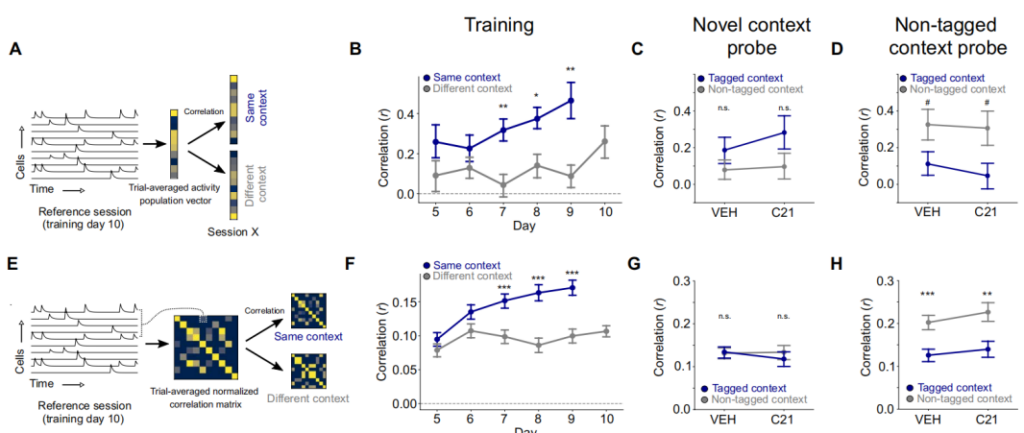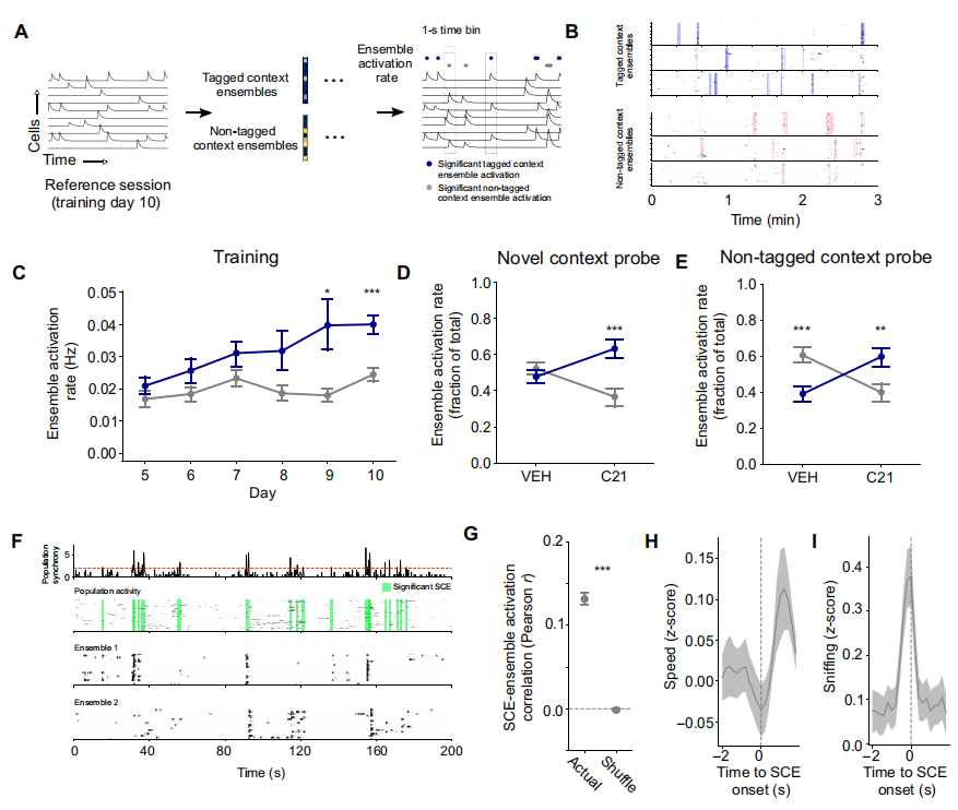 DG context ensemble的再激活也可能是通过影响 CA1 中具有情境特定的离散集群活动来帮助记忆提取。研究人员从群体活动中提取协同集群并分析其激活率发现,CA1中神经元集群的出现以情境和经验依赖的方式在训练中发生变化。同时在测试中,DG context ensemble的再激活增加了CA1中与标记情境相关的集群在新情境和非标记情境中的相对再激活频率,表明情境特定的集群再激活有助于表达情境关联记忆。